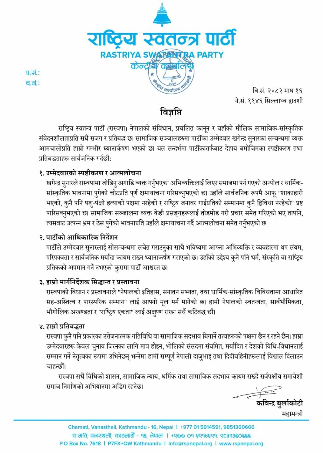 शुक्रबार महामन्त्री कविन्द्र बुर्लाकोटीले विज्ञप्ति जारी गर्दै रास्वपामा जोडिनु अगाडि सुनारले व्यक्त गरेको अभिव्यक्तिलाई लिएर समाजमा पर्न गएको अन्योल र धार्मिक,सांस्कृतिक भावनामा पुगेको चोटप्रति पूर्ण क्षमायाचना मागिसकिएको बताए ।